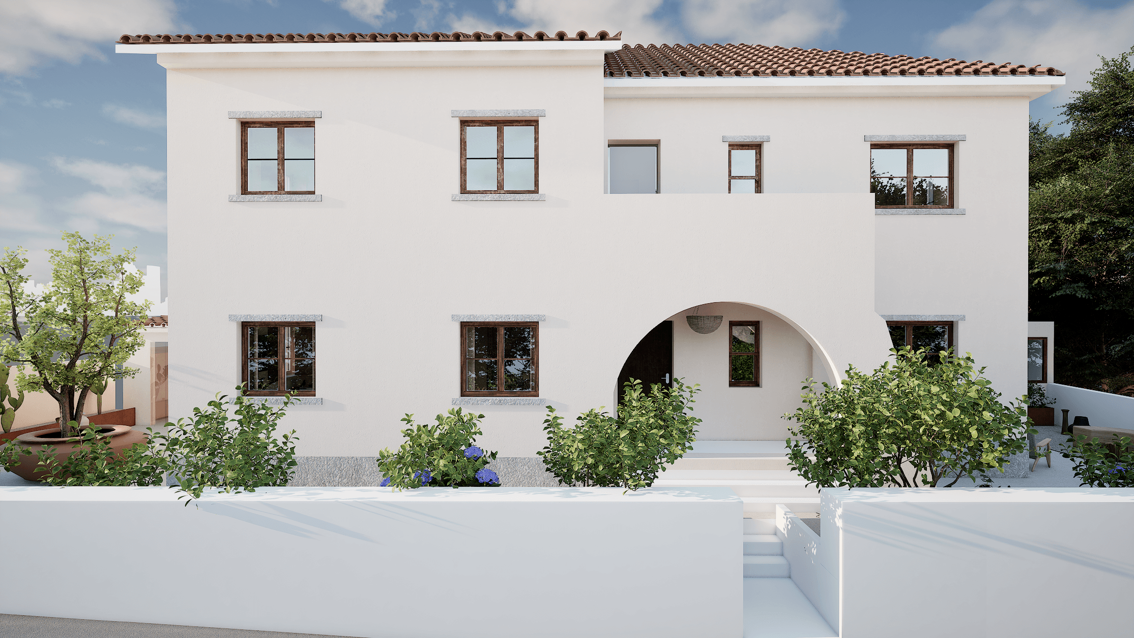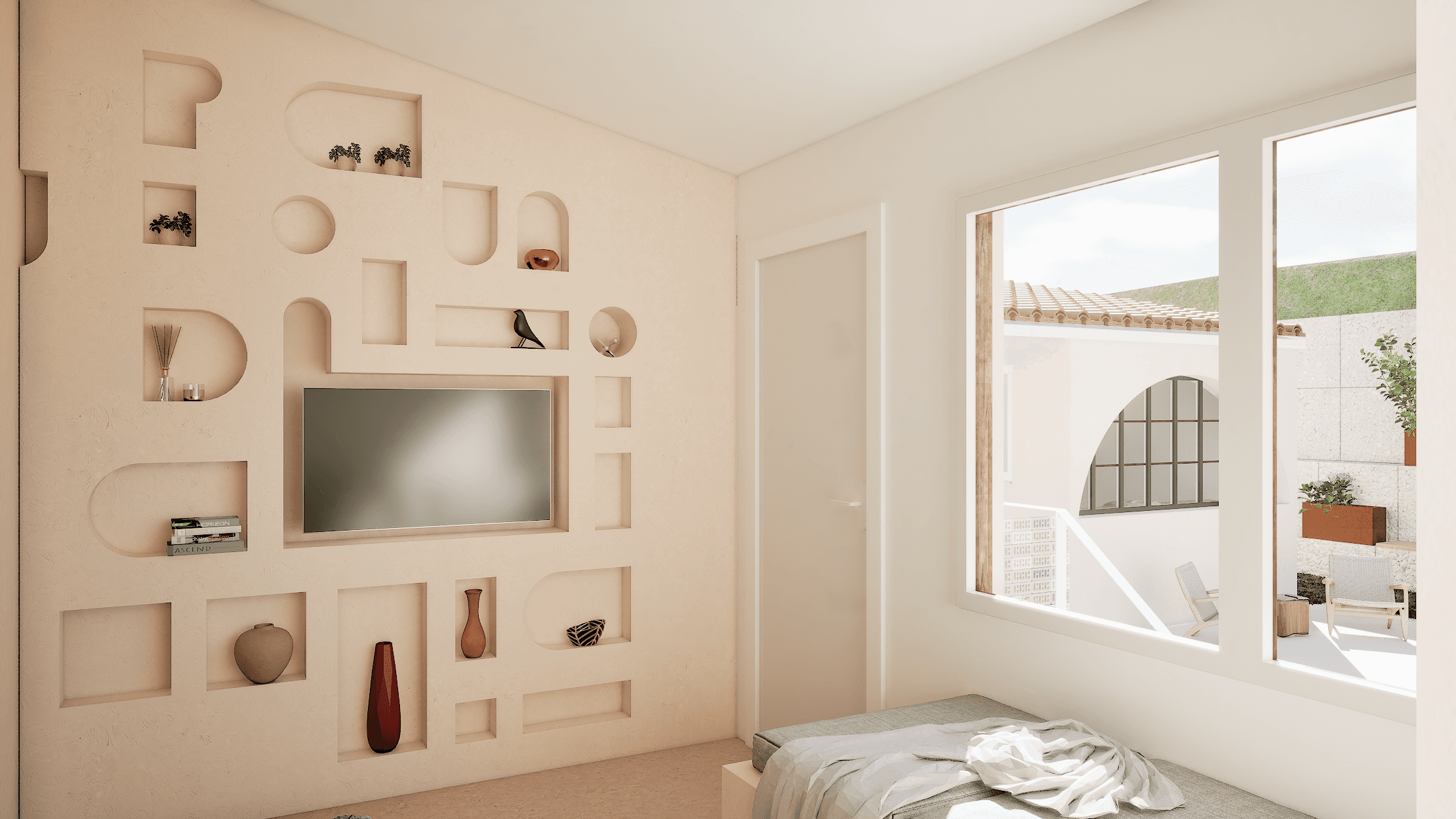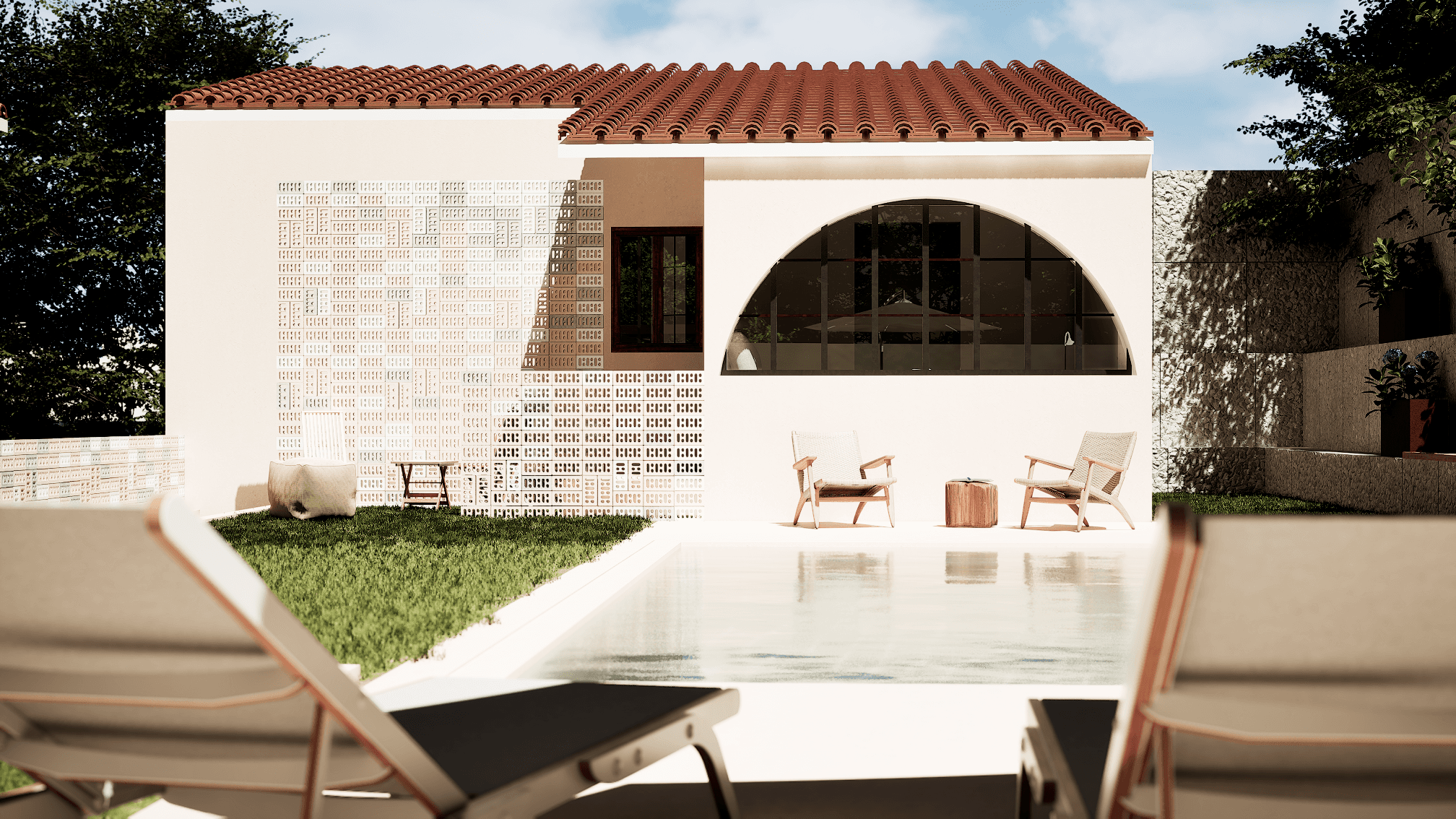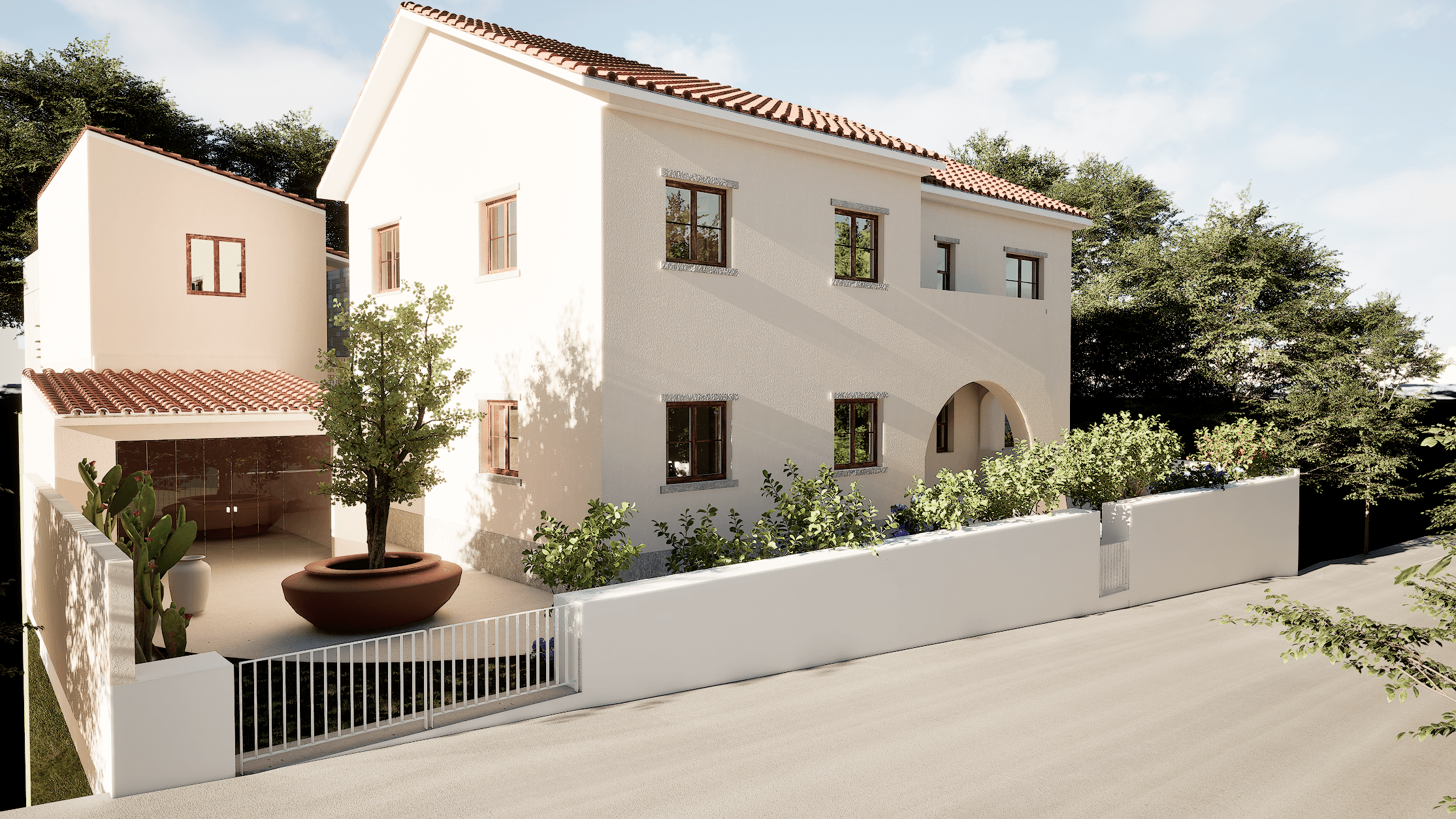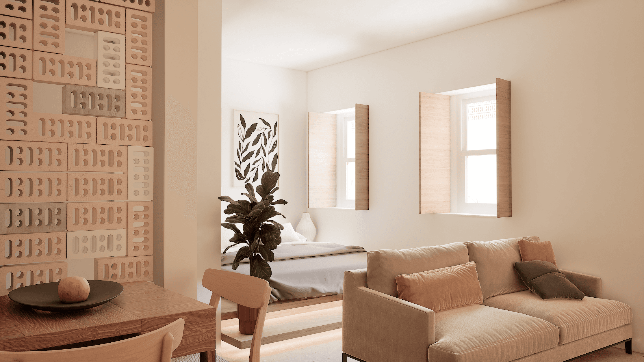 This picturesque house in a very scenic location, just on the other side of the Rio Tejo, a 10-minute boat ride from Belém, is the starting point for a charming guest house. The house was very degraded and in need of a total renovation. It consists of 6 fully equipped apartments with different configurations, boasting a clean and light design, intended to provide a feeling of relaxed and comfortable space. Light and warm materials, as well as light pastel colors, were used to ensure this feeling. There is a co-working space, a minimal garden, and a pool. A pergola and an outside lounge space give the garden a comfortable and inviting feeling.