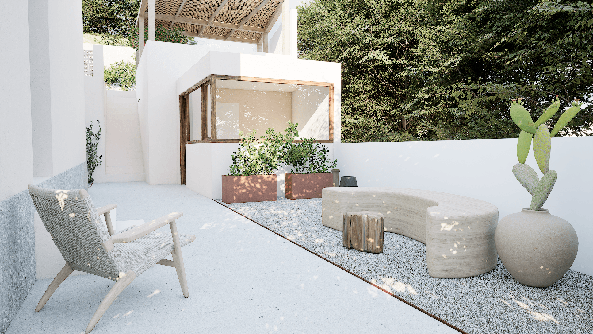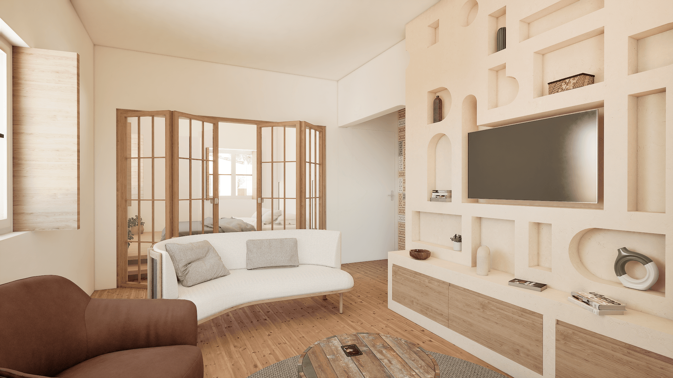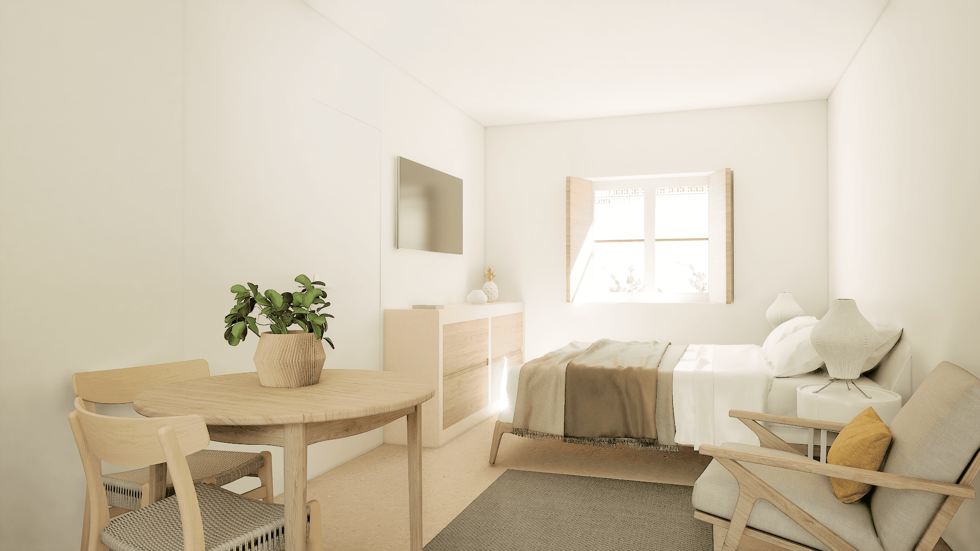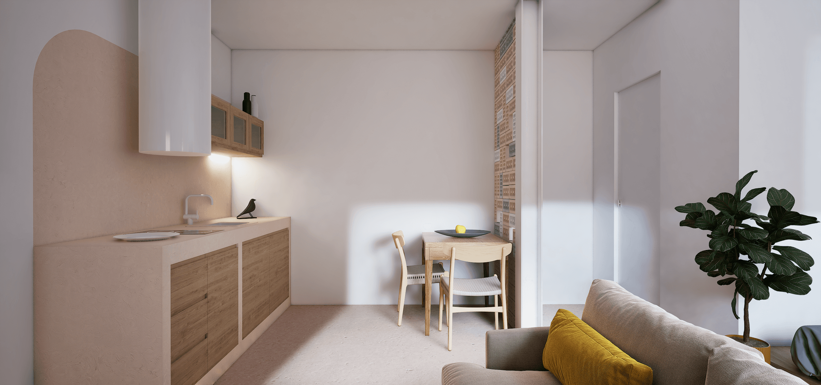 This picturesque house in a very scenic location, just on the other side of the Rio Tejo, a 10-minute boat ride from Belém, is the starting point for a charming guest house. The house was very degraded and in need of a total renovation. It consists of 6 fully equipped apartments with different configurations, boasting a clean and light design, intended to provide a feeling of relaxed and comfortable space. Light and warm materials, as well as light pastel colors, were used to ensure this feeling. There is a co-working space, a minimal garden, and a pool. A pergola and an outside lounge space give the garden a comfortable and inviting feeling.