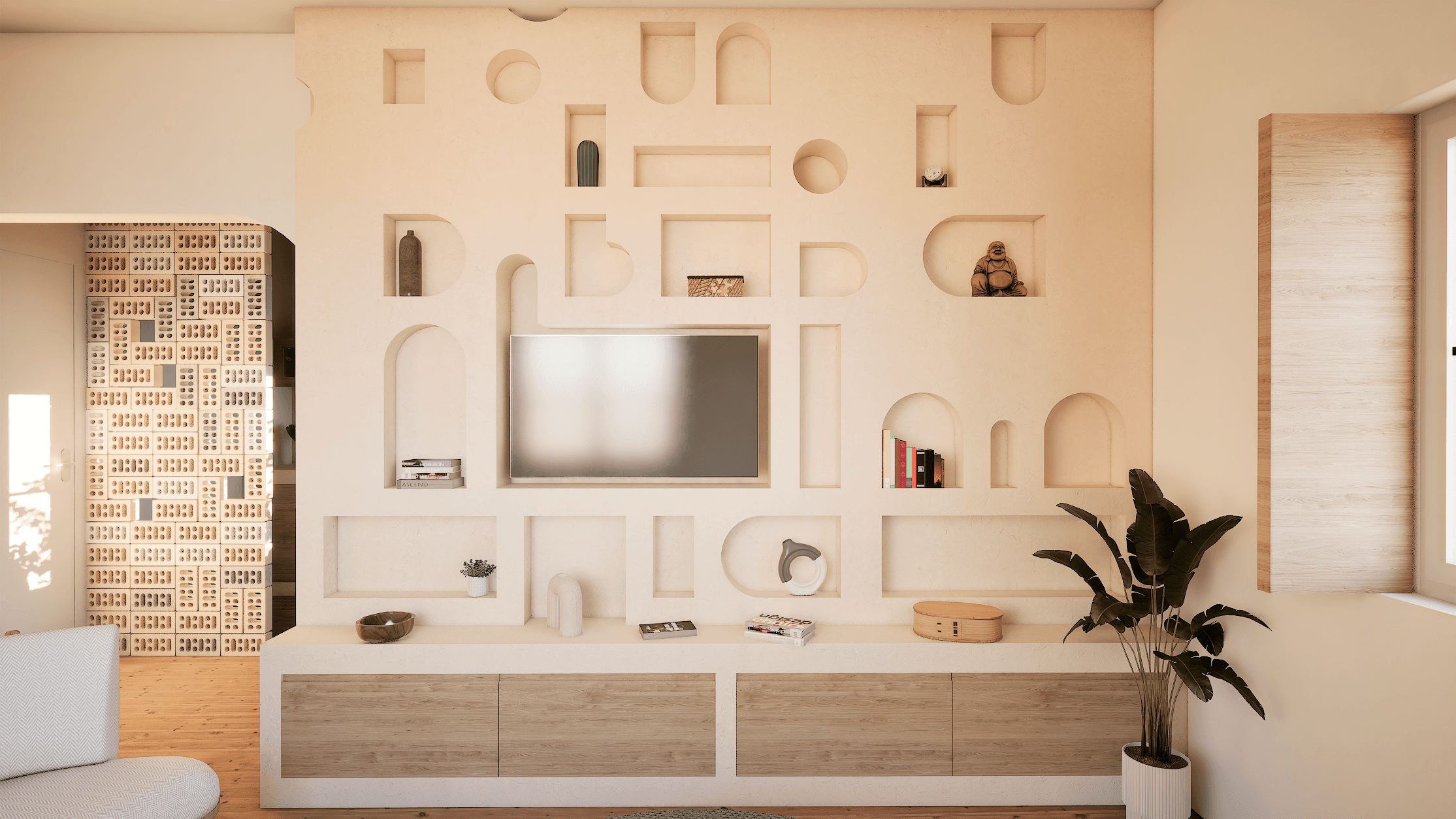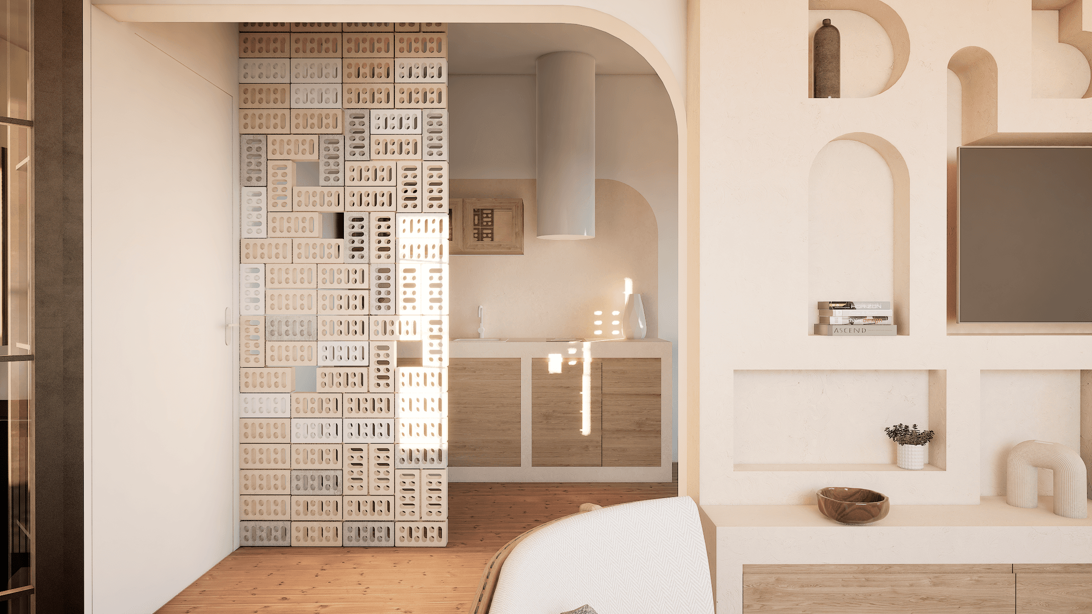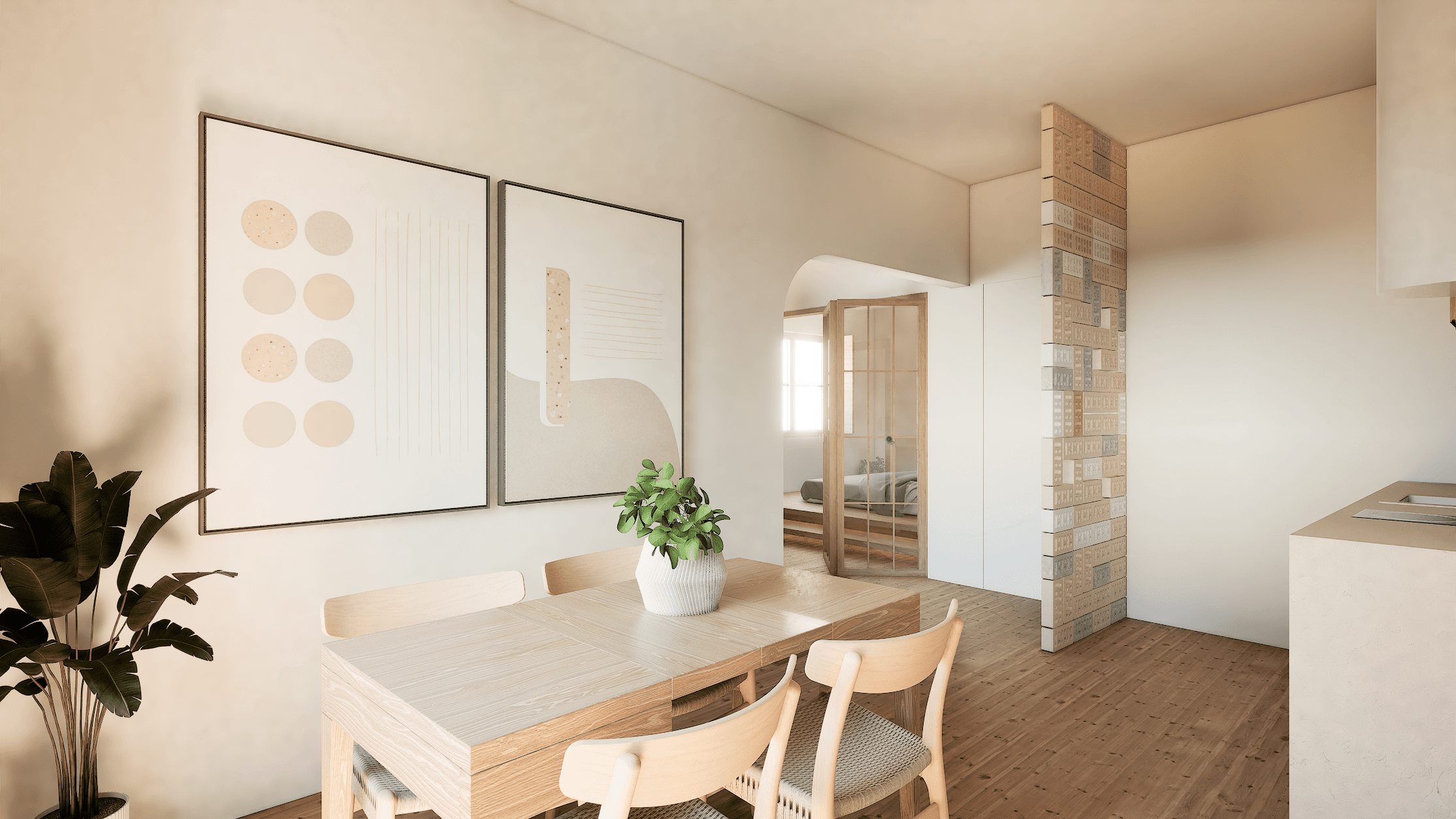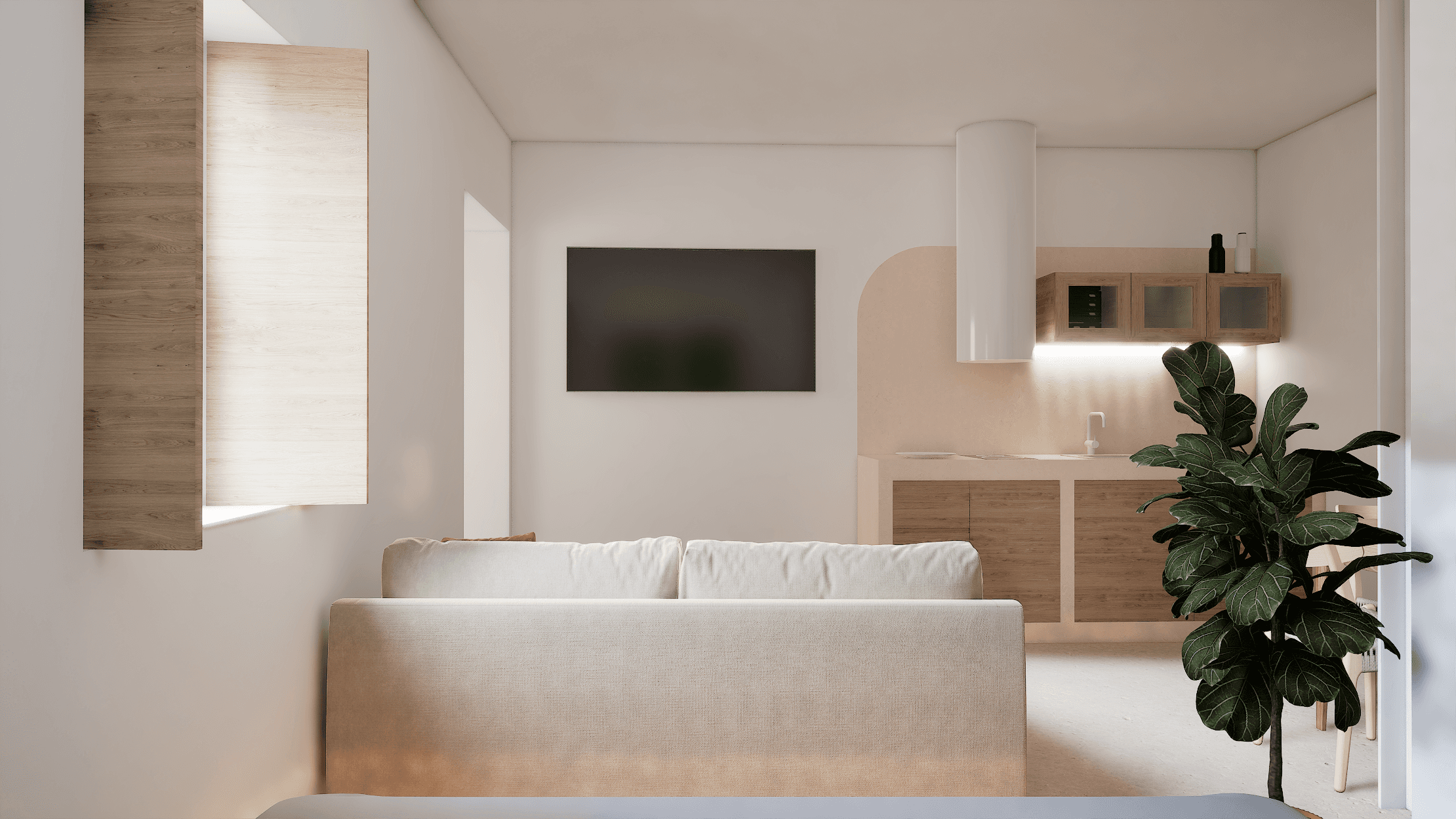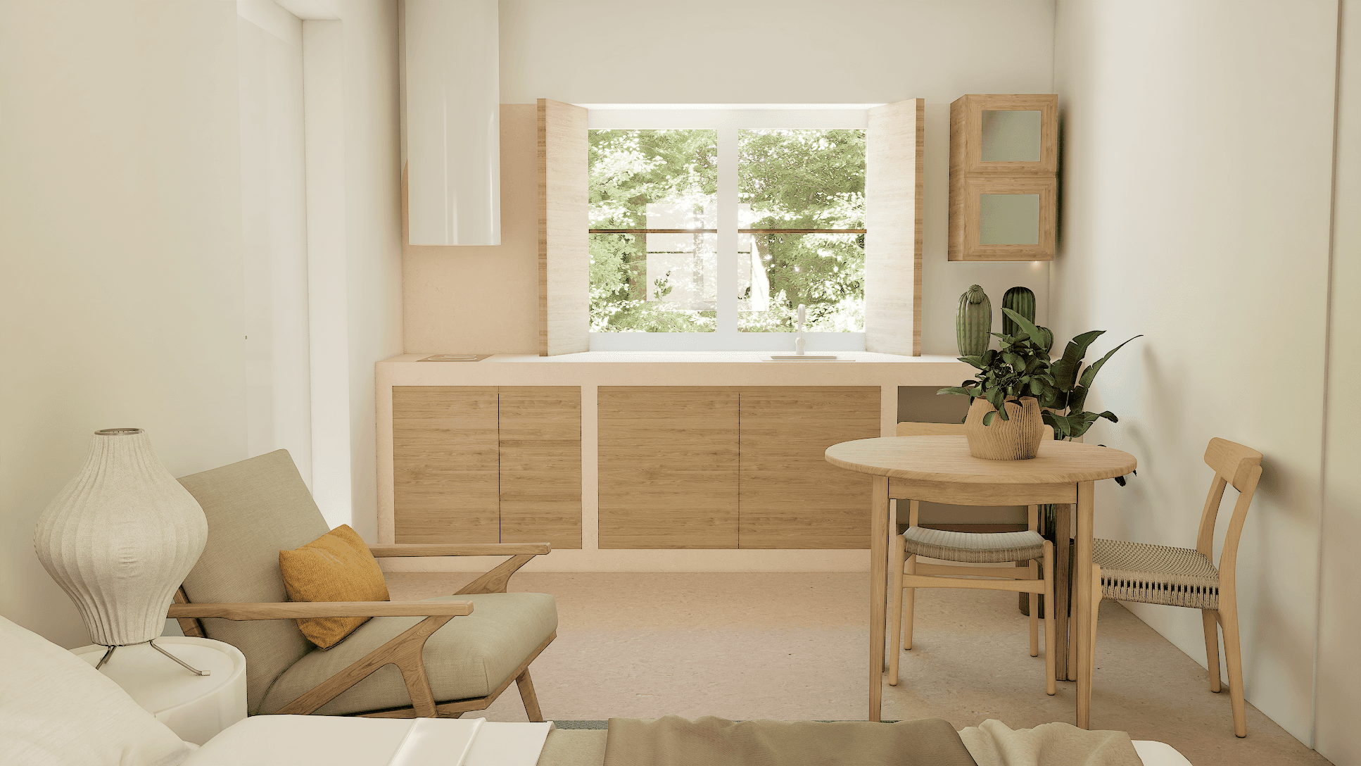 This picturesque house in a very scenic location, just on the other side of the Rio Tejo, a 10-minute boat ride from Belém, is the starting point for a charming guest house. The house was very degraded and in need of a total renovation. It consists of 6 fully equipped apartments with different configurations, boasting a clean and light design, intended to provide a feeling of relaxed and comfortable space. Light and warm materials, as well as light pastel colors, were used to ensure this feeling. There is a co-working space, a minimal garden, and a pool. A pergola and an outside lounge space give the garden a comfortable and inviting feeling.